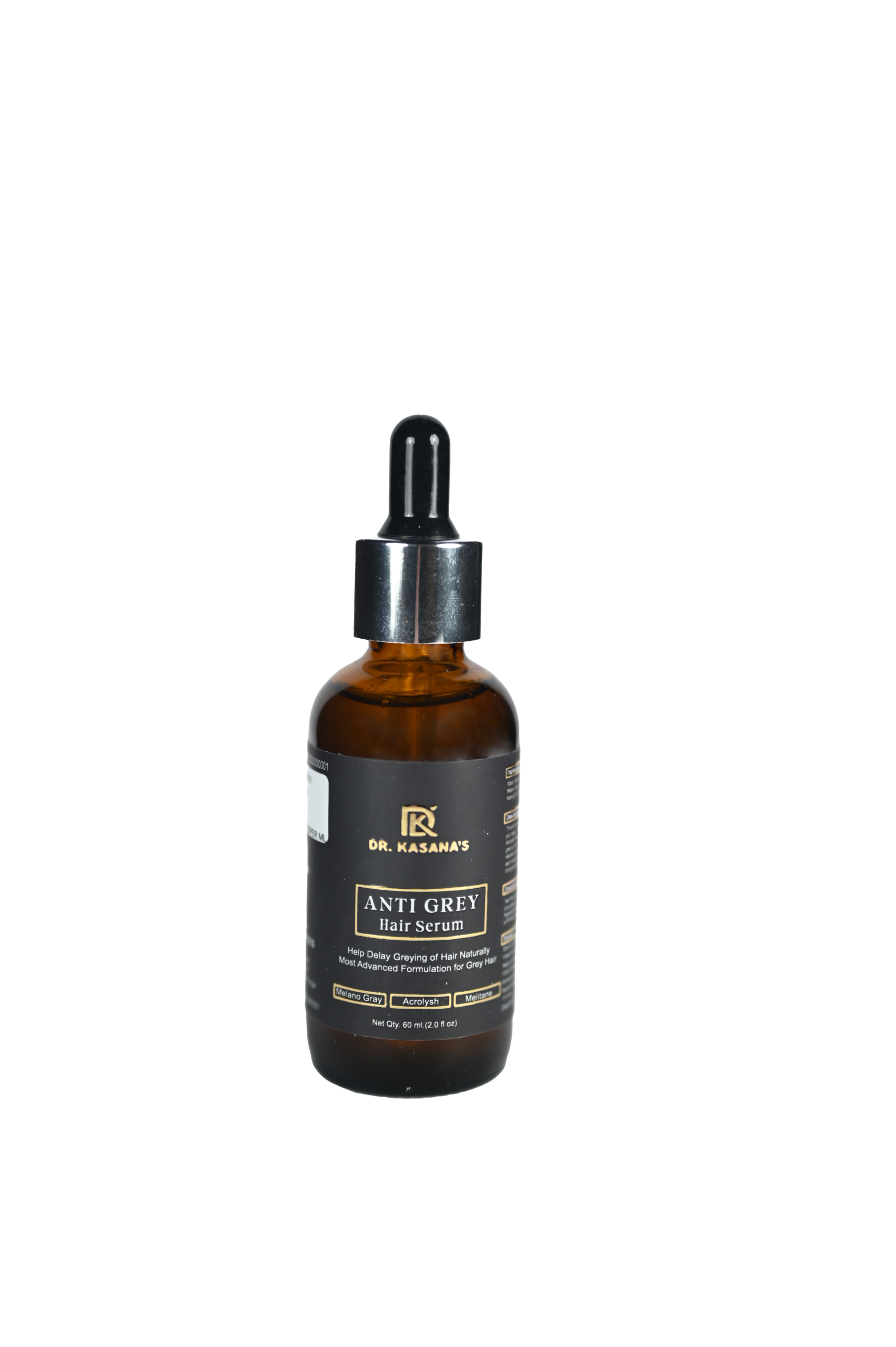 Dr. Kasana’s Anti Grey Hair Serum is a lightweight, highly efficacious scalp serum formulated to help decrease premature greying and support natural melanin production. Enriched with clinically backed actives like Acrolys®, Melitane® and MelanoGray®, this serum restores natural hair colour, stops oxidation-driven greying, and improves overall scalp health.